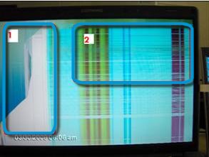 | Đường chéo hoặc lởm chởm và / hoặc sự xuất hiện của cả hai đường ngang và dọc | Đường chéo hoặc lởm chởm (vùng trắng trong 1) và cả hai đường ngang và dọc cho biết thiệt hại của bảng điều khiển. Một bộ đường ngang hoặc dọc có thể là bảng bị hỏng, nhưng cũng có thể do lỗi hệ thống đồ hoạ hoặc cáp video nội bộ bị mất. |